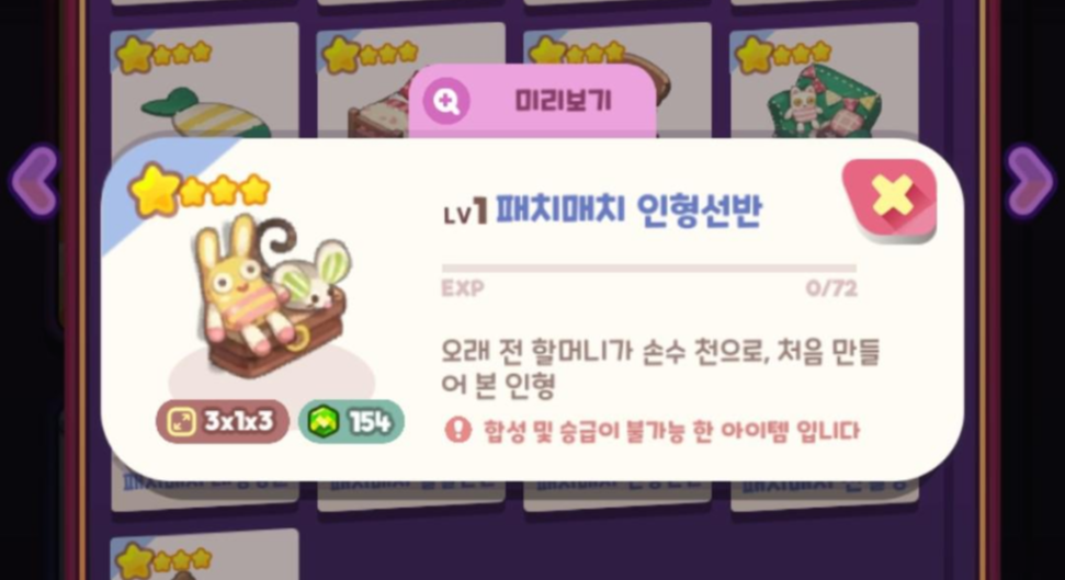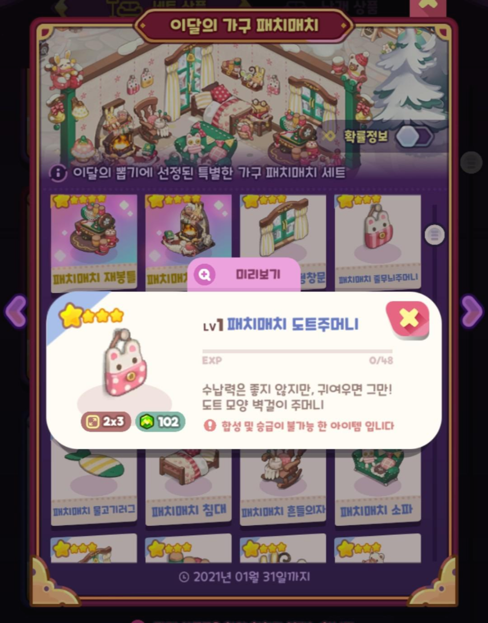 이번에 새로나온 가구입니다. [패치 매치] 귀여운 느낌의 가구입니다. 고양이, 토끼, 쥐 등의 인형들이 보이는군요. 벌써 봄 느낌이 나네요.